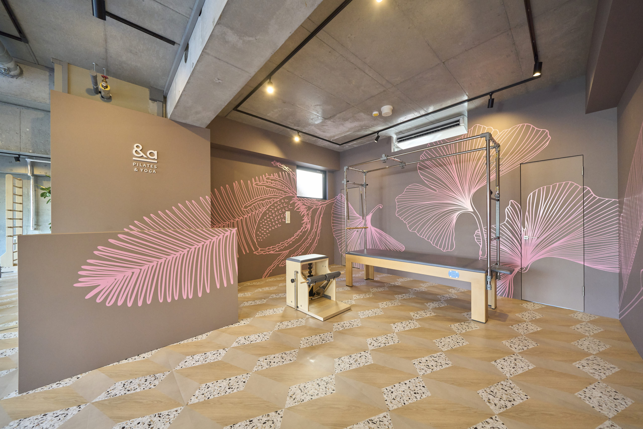 今回は活動的な大人が多い街、成城にオープンするため、他の街のスタジオに比べ少し落ち着いた印象のカラーに、気分を上げるピンクのボタニカルイラストで全体を構成しました。