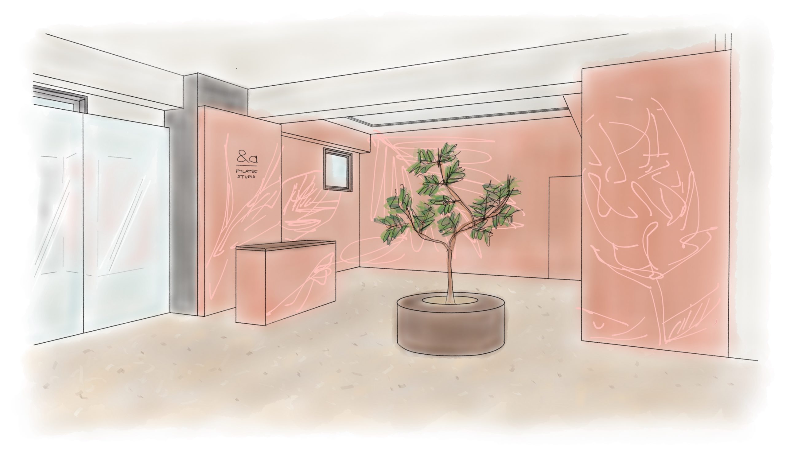 今回は活動的な大人が多い街、成城にオープンするため、他の街のスタジオに比べ少し落ち着いた印象のカラーに、気分を上げるピンクのボタニカルイラストで全体を構成しました。